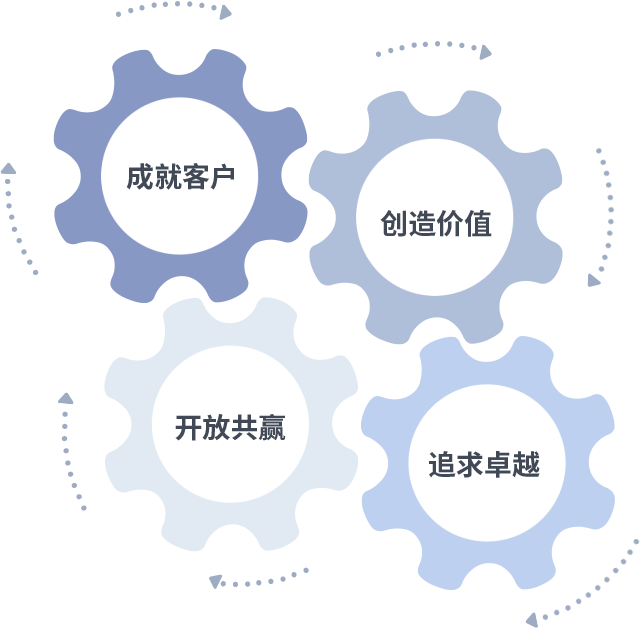 成就客户是一切决策的出发点,创造价值是衡量所有工作的标准,追求卓越是太阳成tyc7111cc做事做人的态度,开放共赢是太阳成tyc7111cc的格局也是最终的结果。价值观的齿轮环环相扣,推动着组织里的每个人不断向前。